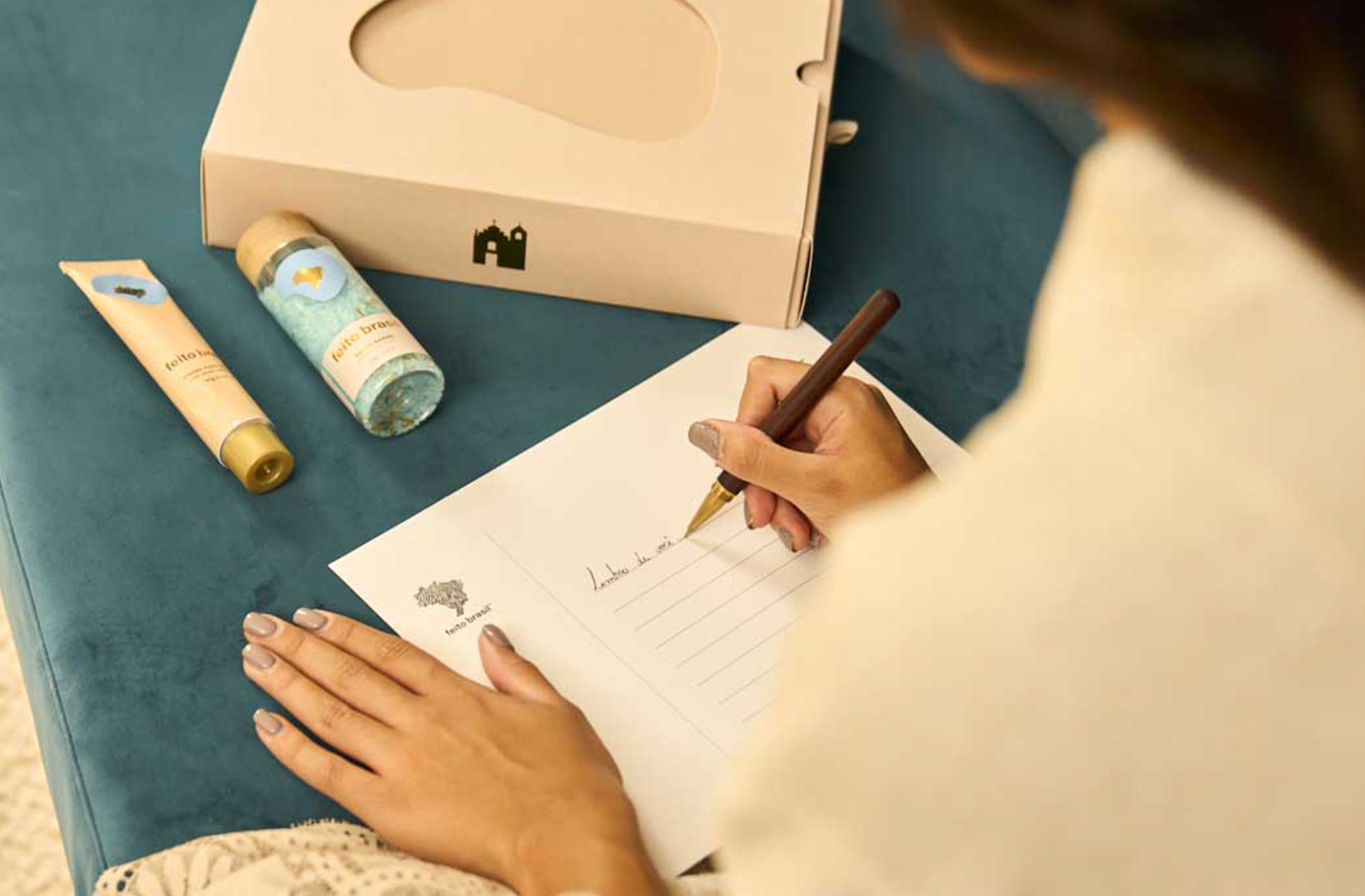 As embalagens se destacam pelo acabamento premium e pelo design presenteável, que inclui uma gaveta especial para os cartões postais exclusivos de cada local do sul da Bahia: Caraíva, Porto Seguro, Corumbau e Trancoso. Esses cartões trazem memórias afetivas e reforçam a conexão com a coleção.