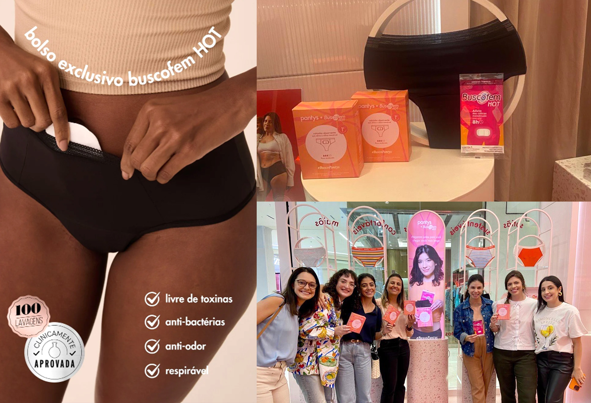 BuscoPantys une duas marcas referência para o público feminino — Buscofem e Pantys — para criar uma solução inédita no mercado brasileiro: a primeira calcinha menstrual absorvente com bolso interno exclusivo para o adesivo térmico Buscofem Hot. Ideal para quem busca conforto durante a menstruação, oferece proteção para fluxo moderado e alívio das cólicas por até 8 horas. Seu design funcional, moderno e anatômico promove bem-estar e praticidade no dia a dia.