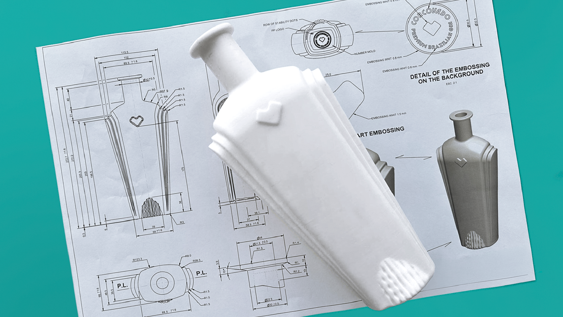 O relevo na base da garrafa, além de valor simbólico, guia a posição correta do rótulo durante a aplicação e reforça a estabilidade ao manusear a garrafa. A rolha é de fácil abre e fecha, gráfico e estrutural se encaixam em uma experiência tátil marcante gerando diferenciação nos pontos de venda.