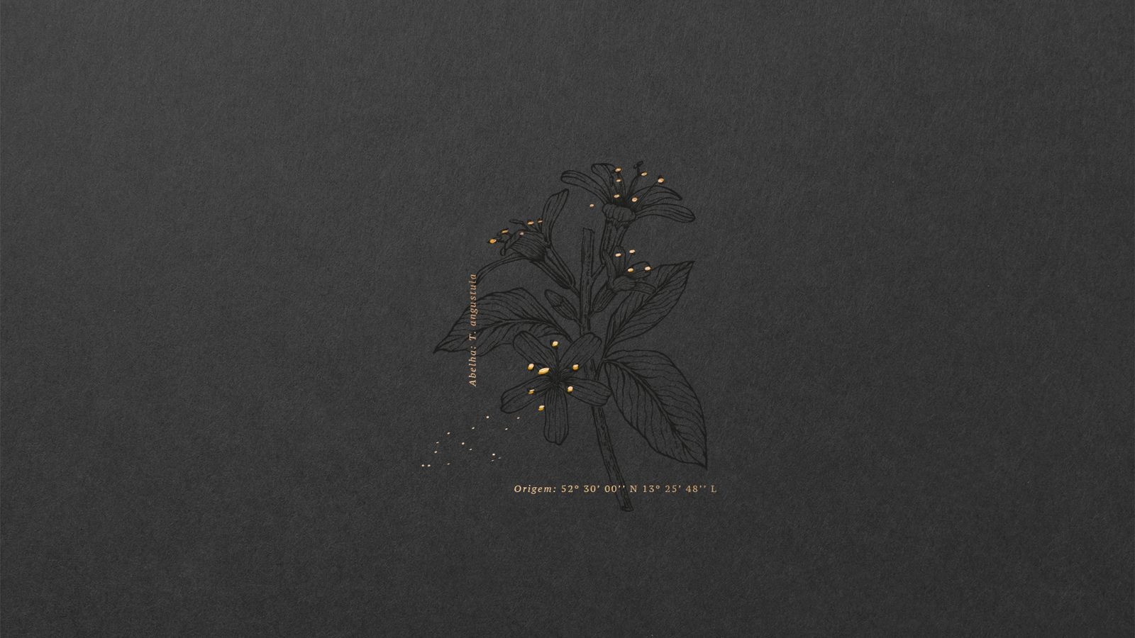 O monograma central comunica tradição e sofisticação. As laterais aprofundam o storytelling com ilustração autoral do bioma, coordenadas e espécie da abelha. A abertura revela o produto como uma joia no centro do berço. Detalhes em hot stamping dourado remetem ao pólen sobre a vegetação nativa.