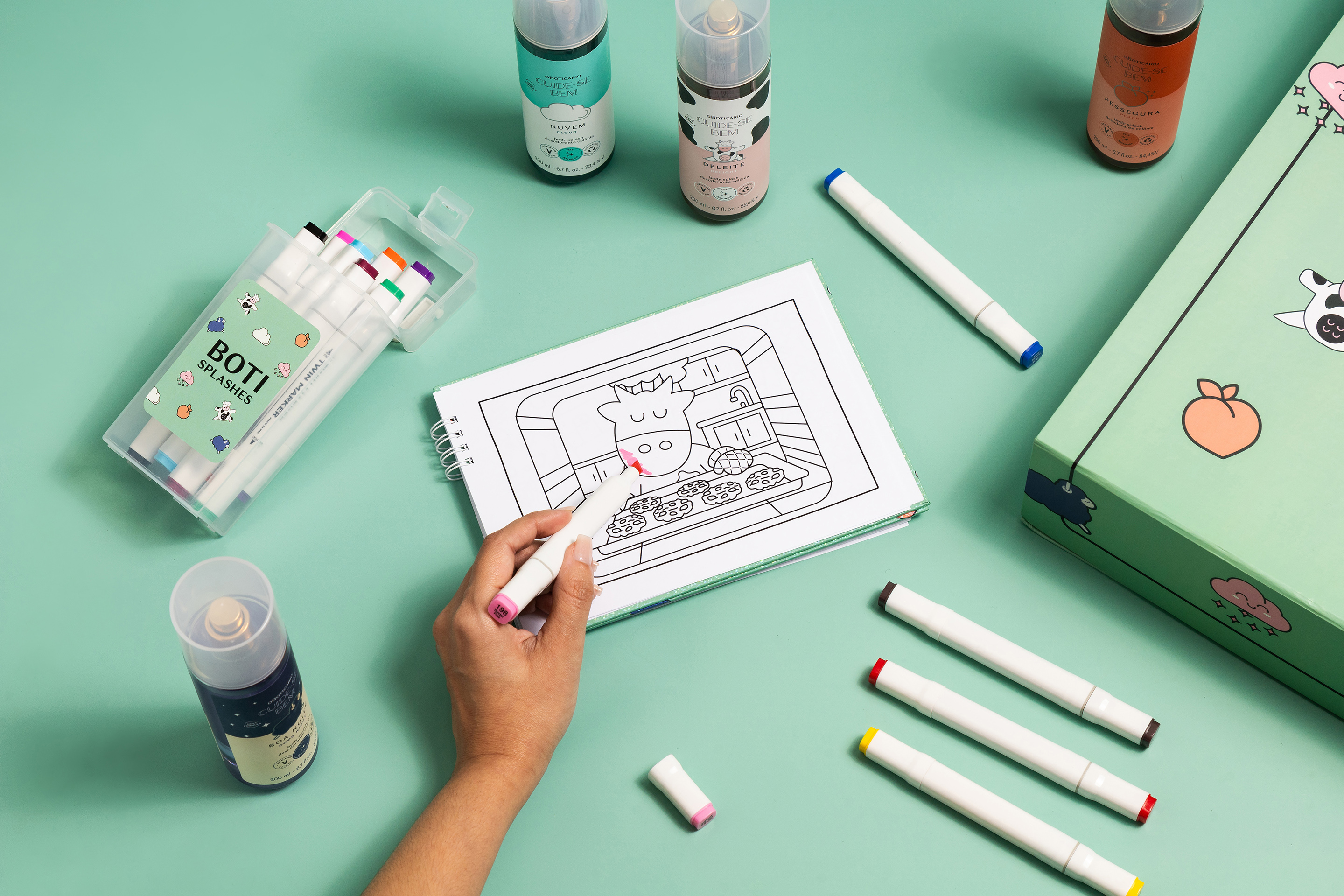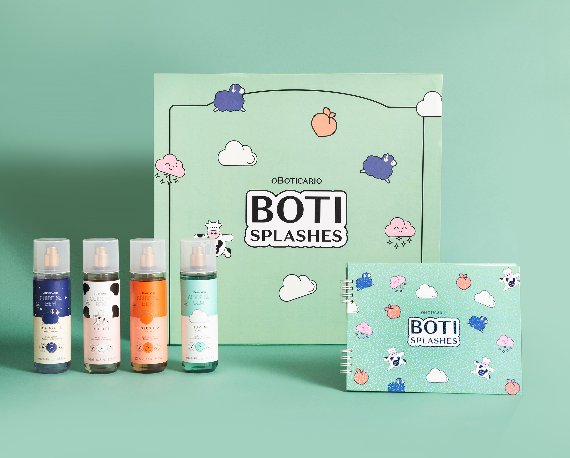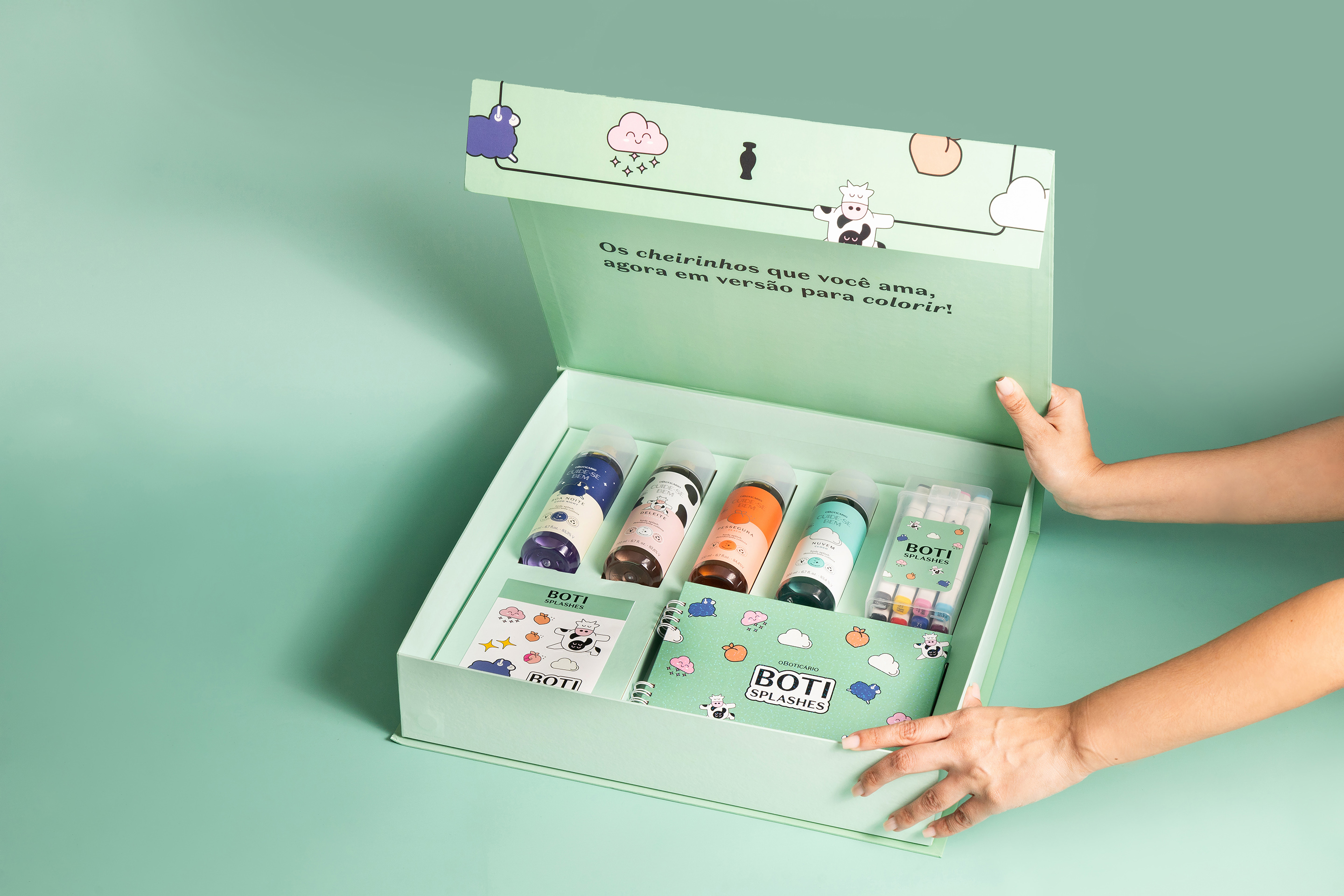A embalagem é um Press Kit que chama atenção para os body splashes da marca Cuide-se Bem. Unimos os ícones da marca à tendência dos livros de colorir, criando um kit com produtos, canetas, adesivos e livro de colorir personalizado, além disso, disponibilizamos as ilustrações para download gratuito Boti Splashes amplifica a experiência do consumidor com produtos clássicos da marca, entrando em uma tendência do mercado de forma pioneira. Surpreendendo a comunidade com uma solução criativa, popular entre o target e que proporciona uma nova camada de relaxamento a rotina de autocuidado.