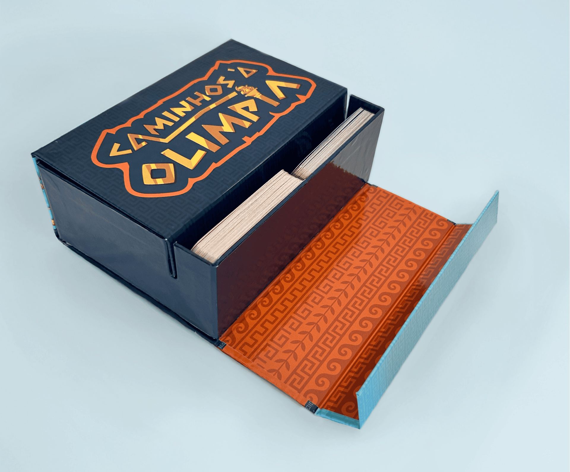 A tampa não se desprende da caixa, agregando maior durabilidade ao sistema, pois não tem como perdê-la. O armazenamento da cartas do baralho na vertical se provam uma maneira ergonômica de retirar as cartas, sendo facilitada até mesmo para crianças pequenas. Conta com ilustrações autorais alinhadas ao contexto históricos da temática proposta: os grafismos são baseados em afrescos gregos. O logo, as cores e a identidade visual foram pensados para dialogar de forma coesa com as ilustrações, criando uma unidade estética que reforça a proposta do projeto.