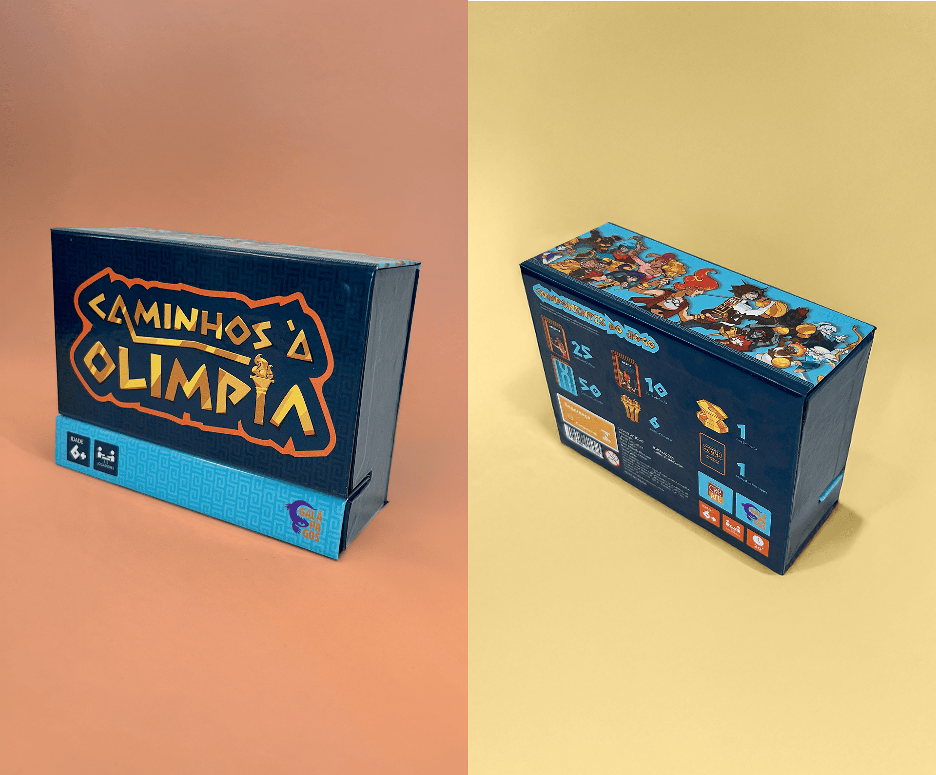 Com foco em eficiência e apelo visual, a embalagem do jogo “Caminhos a Olímpia” foi desenvolvida em ambiente universitário com o desafio de atender ao formato pocket, um dos pré-requisitos do projeto, respeitando o volume máximo estipulado de 10x20cm. A solução permite organizar peças variadas com resistência e praticidade, sem comprometer o transporte. Também, adota fechamento por encaixe e possui visual lúdico para atrair o público no ponto de venda.