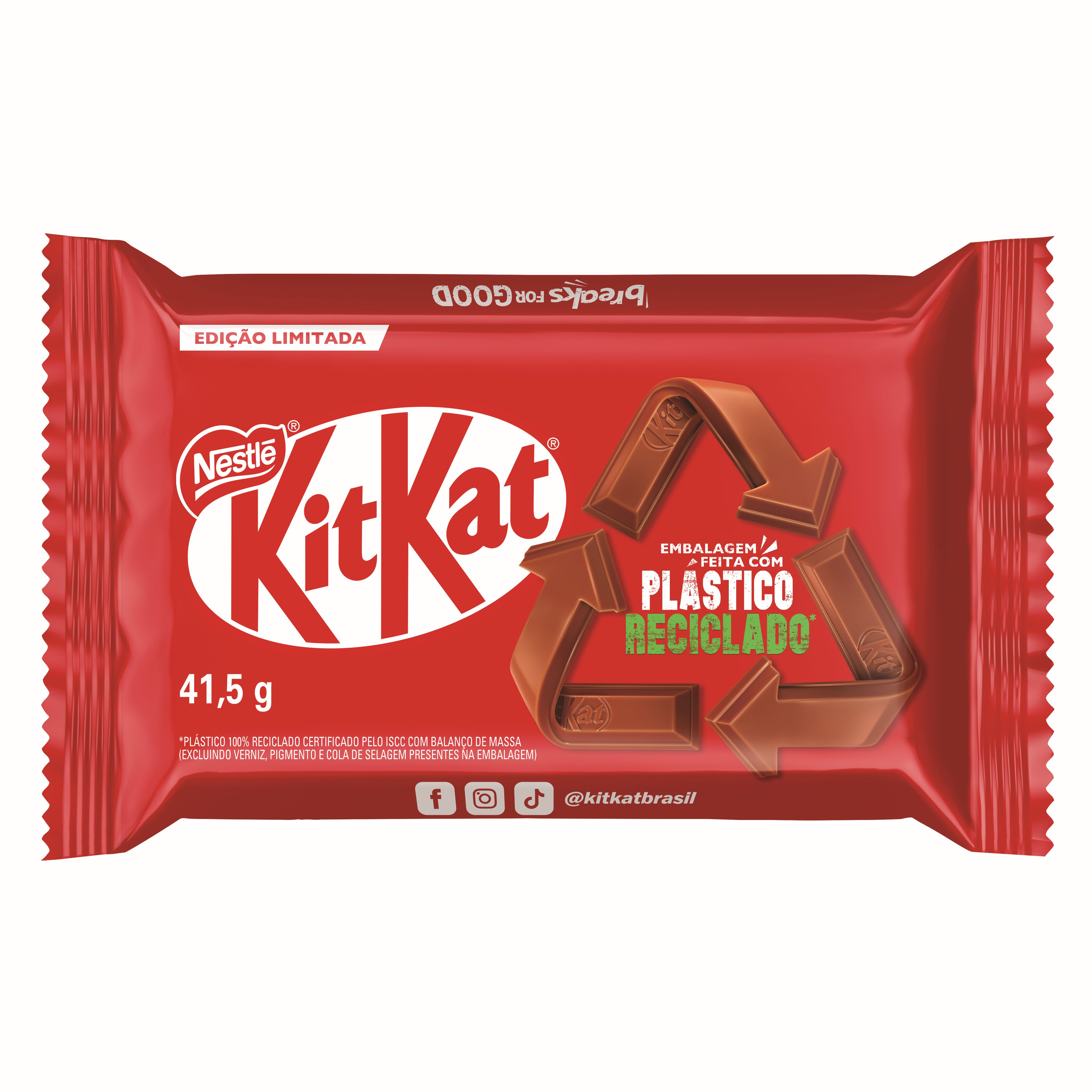 Em outubro de 2024, Kitkat foi o chocolate brasileiro pioneiro em lançar uma embalagem reciclável e reciclada, utilizando PCR em toda a composição e certificado pelo ISCC. A primeira produção utilizou mais de 5,5 toneladas de plástico reciclado, o que contribui em duas frentes muito importantes: a educação do consumidor sobre o tema, e o aumento da demanda pelo PCR, gerando mais velocidade e interesse na reciclagem de plástico flexíveis, garantindo uma circularidade que não acabe em downcycling