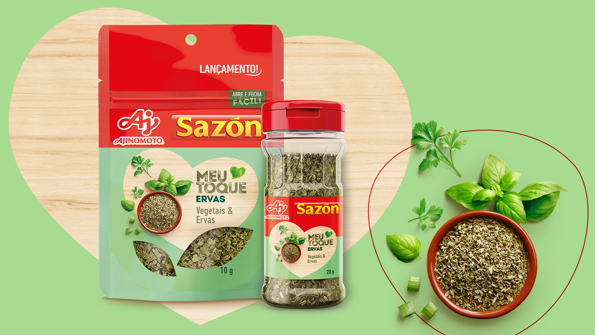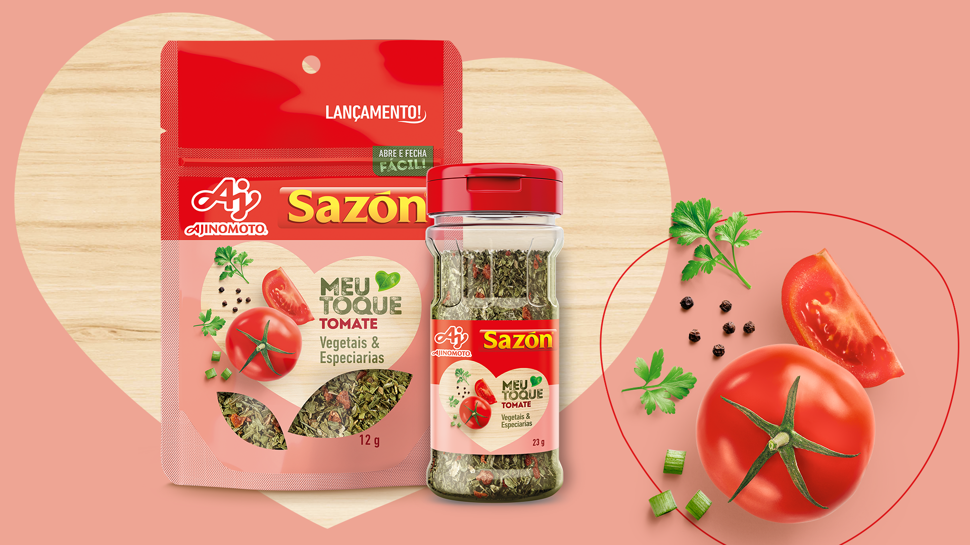SAZÓN® Meu Toque é uma linha de mixes de especiarias, vegetais e ervas desidratadas que consolida a entrada de SAZÓN® no segmento de temperos naturais. Além da composição dos produtos, as embalagens também são inovadoras para a marca, pois são seus primeiros itens vendidos em potes e standup pouches. O desafio era reforçar os atributos de naturalidade da linha, lidar com formatos e tamanhos diferentes dos que eram habituais, e com as necessidades de uma gôndola nova para SAZÓN® nos PDVs.