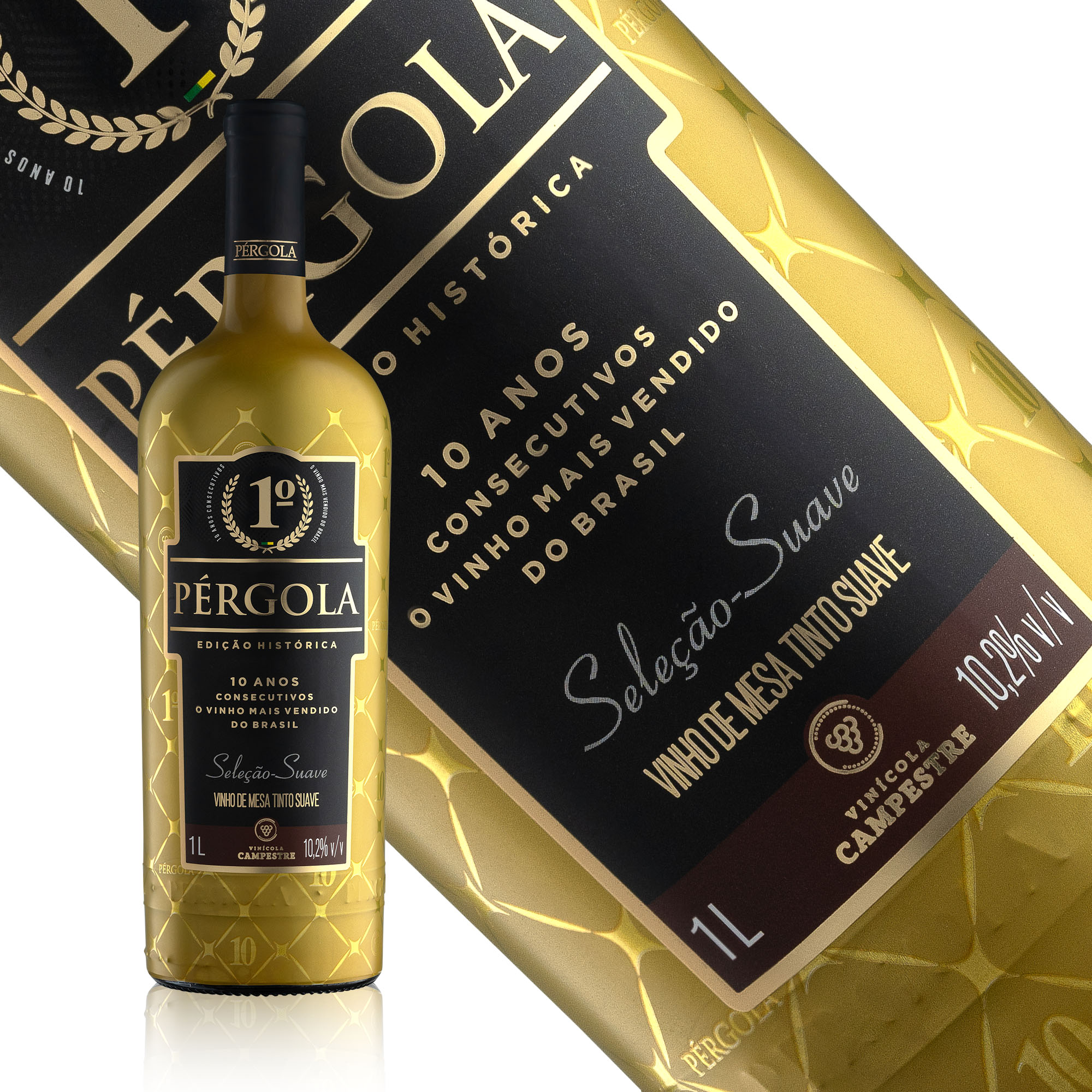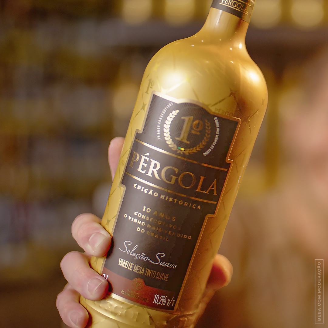 Para celebrar 10 anos de sucesso do vinho Pérgola, foi criado o rótulo sleeve dourado com forte impacto visual imitando uma garrafa pintada de dourado. O desafio foi alcançar um dourado intenso que cobrisse a cor do vidro, com fundo fosco e detalhes brilhantes, sem comprometer o encolhimento do sleeve. O processo exigia precisão extrema, pois o calor podia causar manchas e falhas. A solução veio com o desenvolvimento de uma máquina específica de encolhimento para garantir o efeito desejado.