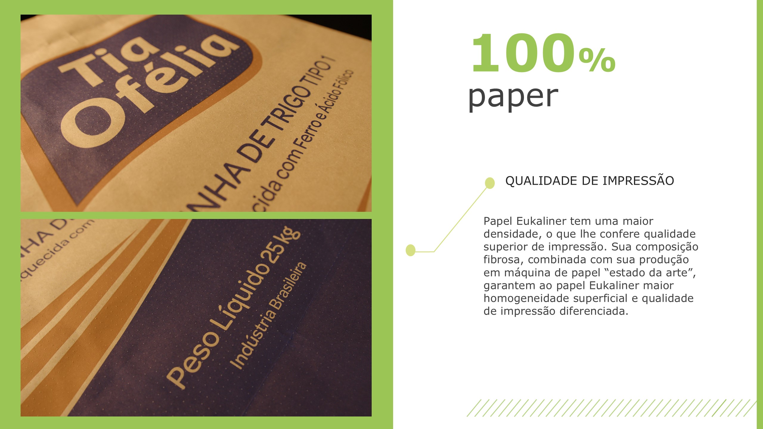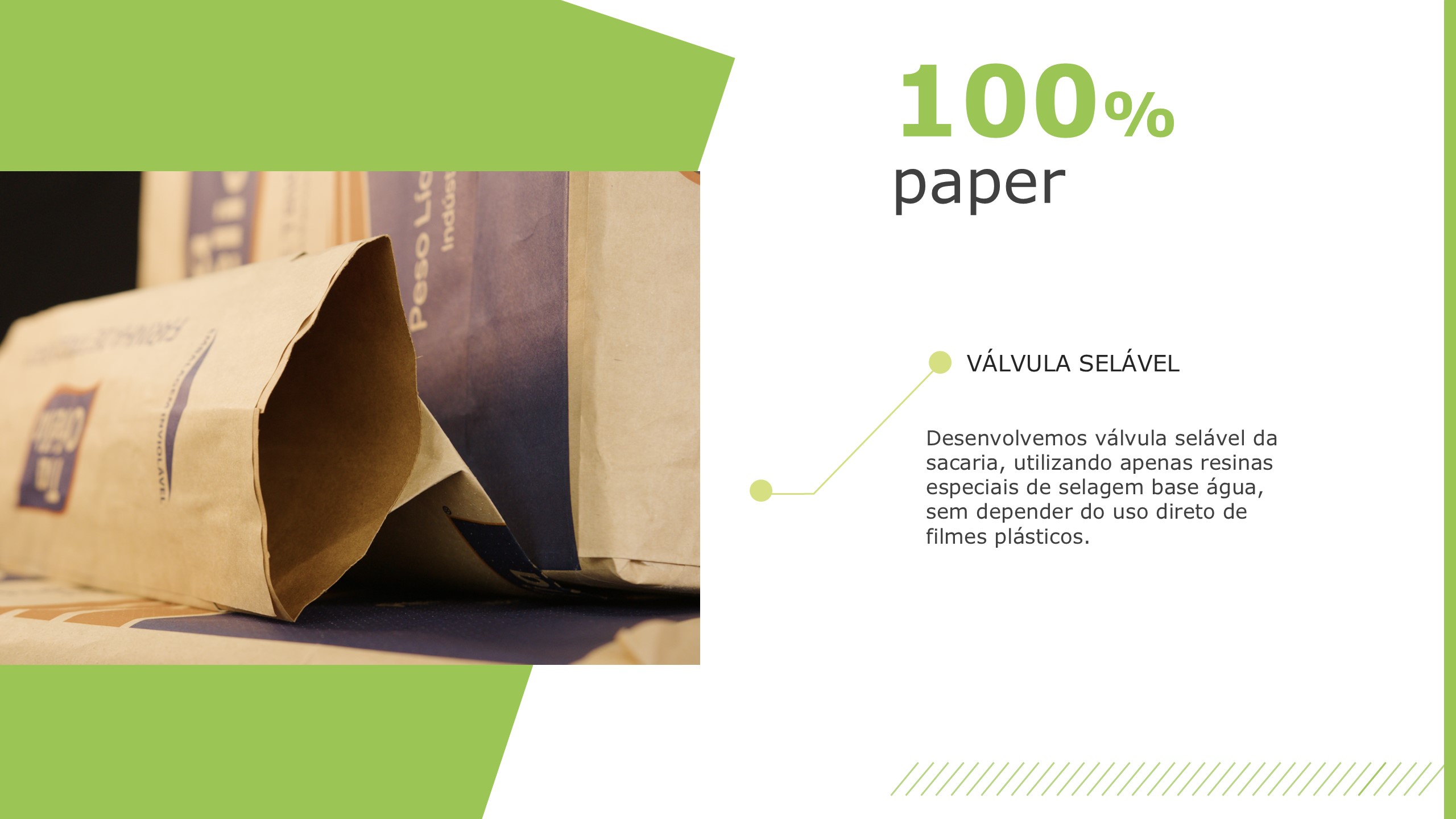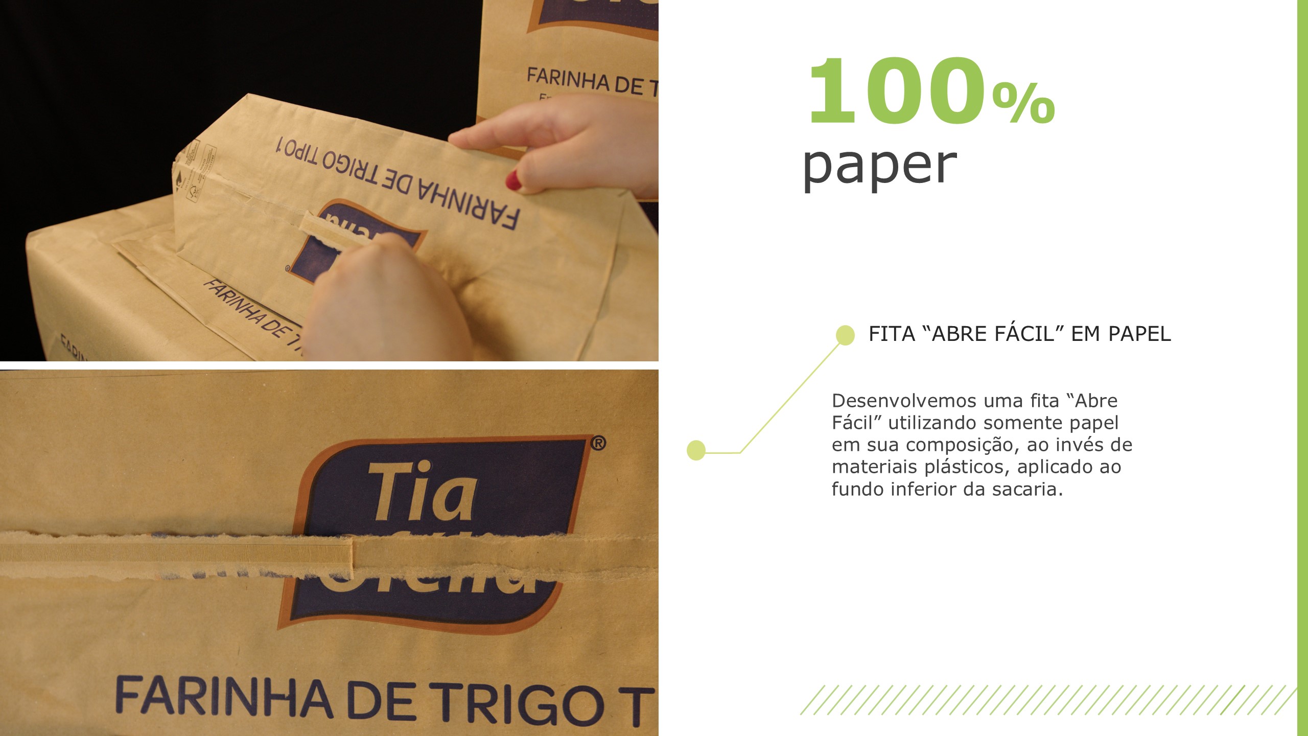 Desenvolvemos uma fita “Abre Fácil” utilizando somente papel em sua composição. Trazendo praticidade no uso, abertura no fundo da sacaria sem utilização de objetos perfurocortantes. O papel tem uma maior densidade, confere qualidade superior de impressão. Sua composição fibrosa, de fibras curtas, combinada com sua produção em máquina de papel “estado da arte”, garantem ao papel maior homogeneidade superficial e qualidade de impressão diferenciada.