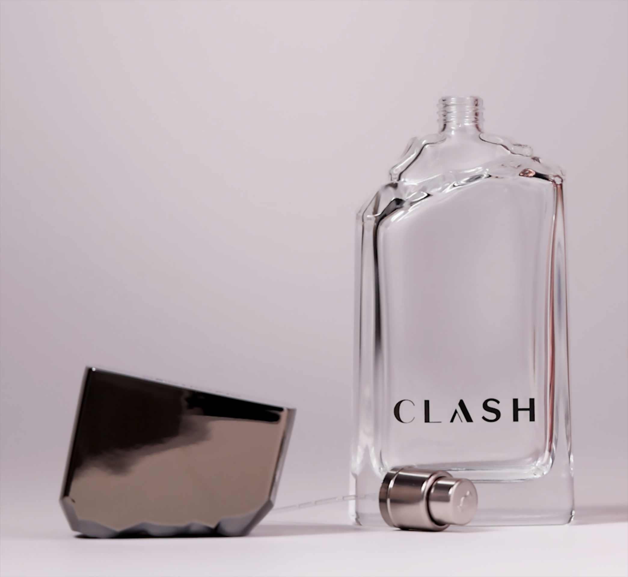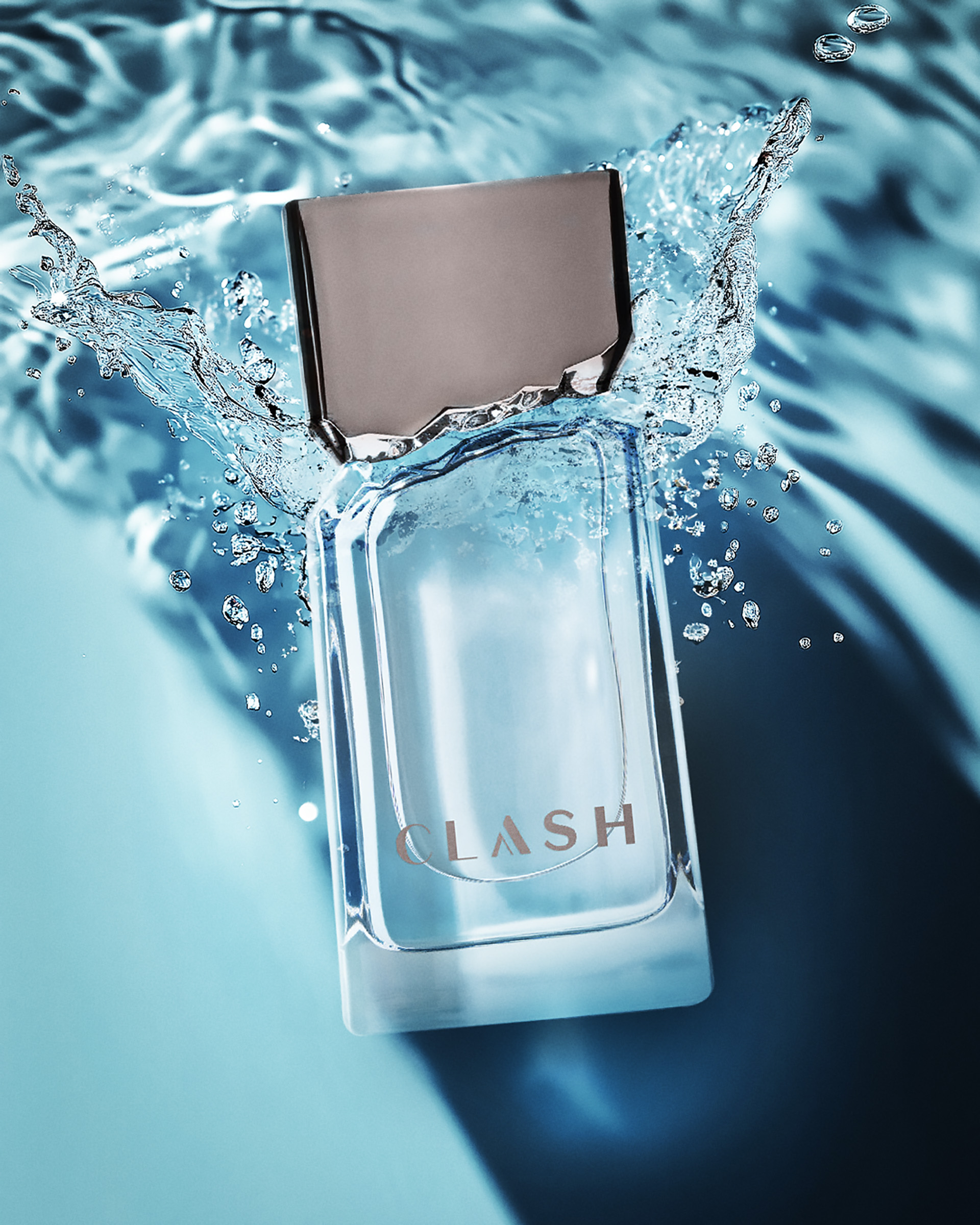 Clash une sofisticação, frescor e conexão com o público, traduzindo o storytelling da marca: a quebra das antigas expectativas masculinas. O frasco pesado, com linhas retas, fundo grosso e uma “quebra” entre frasco e tampa, exigiu intenso trabalho junto com fornecedores, ajustes técnicos e de processo. A tampa, sobre injetada e metalizada, reforça a percepção de alta qualidade. O cartucho segue o mesmo conceito com efeito espelhado e relevo nas rachaduras, reforçando a identidade da marca.