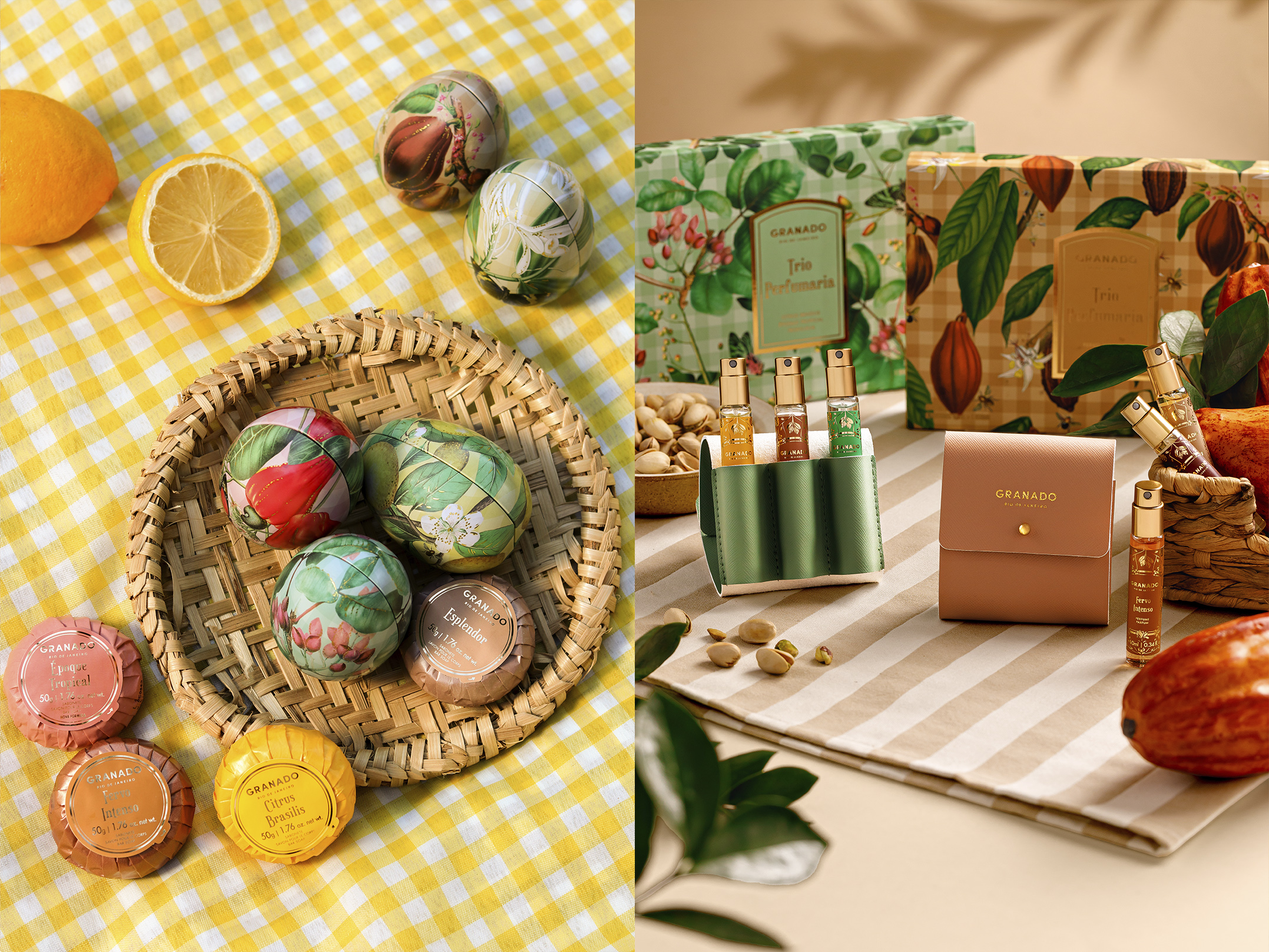 As estampas elaboradas destacam de forma lúdica os elementos de cada uma das 5 fragrâncias: cacau, baunilha, pistache, limão e caju. Mantendo a identidade da linha Vintage da Granado e com refinado acabamento em hot stamping, reforçam o conceito Gourmand, tornando os kits altamente presenteáveis. Há 5 anos, a Granado marca presença na Páscoa para quem não faz questão de chocolate. Além dos porta-perfumes, trazemos latas em formatos de ovos contendo sabonetes que são um charme à parte. A lata em cesta de picnic, com miniaturas e produtos em tamanho original, reforça o conceito da campanha.