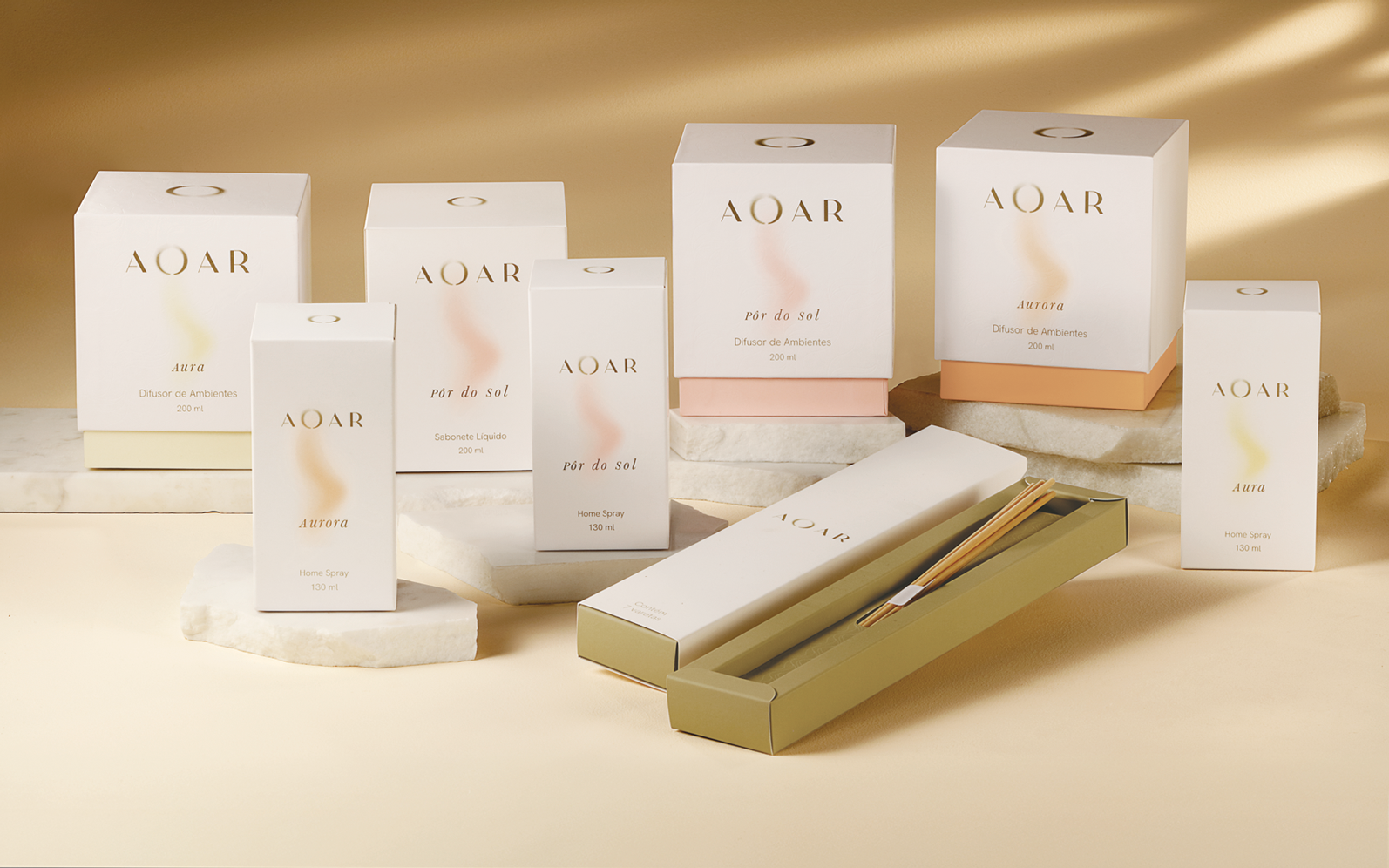 Desenvolvemos posicionamento, naming, identidade, tom de voz, arquitetura e embalagens para Aoar, marca premium de aromatização. Inspirada na “beleza do invisível”, sua identidade se constrói em sutilezas. O “O” do logotipo tem duas versões, vetorial e difusa, funcionando como ícone sensorial. A linguagem visual reforça leveza e sofisticação em todos os pontos de contato, desde cartuchos com relevos até o manifesto poético impresso nas alças das sacolas.