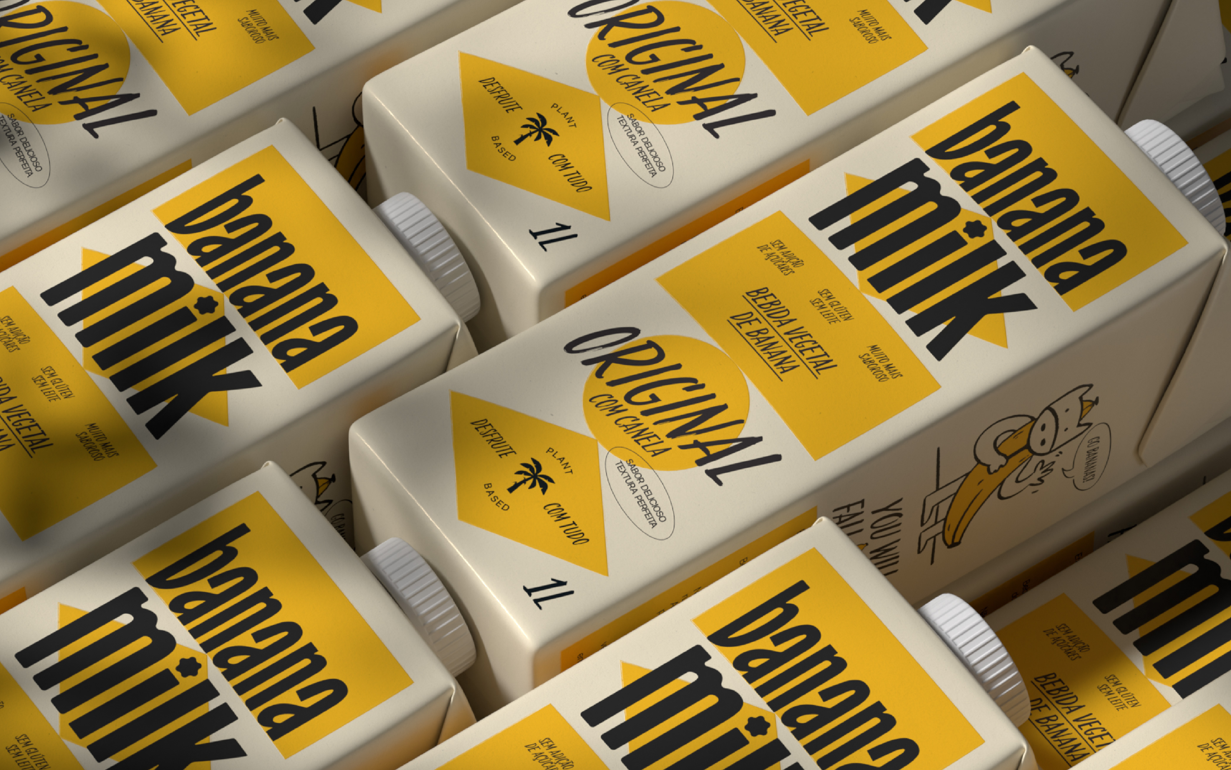 A embalagem mostra os benefícios nutricionais e captura a cultura brasileira com olhar contemporâneo, divertido e livre de clichês. A marca usa a tipografia vernacular, de mercados de frutas, a personagem banana (vestida de vaca e musculosa) e formas geométricas presentes na bandeira nacional.
