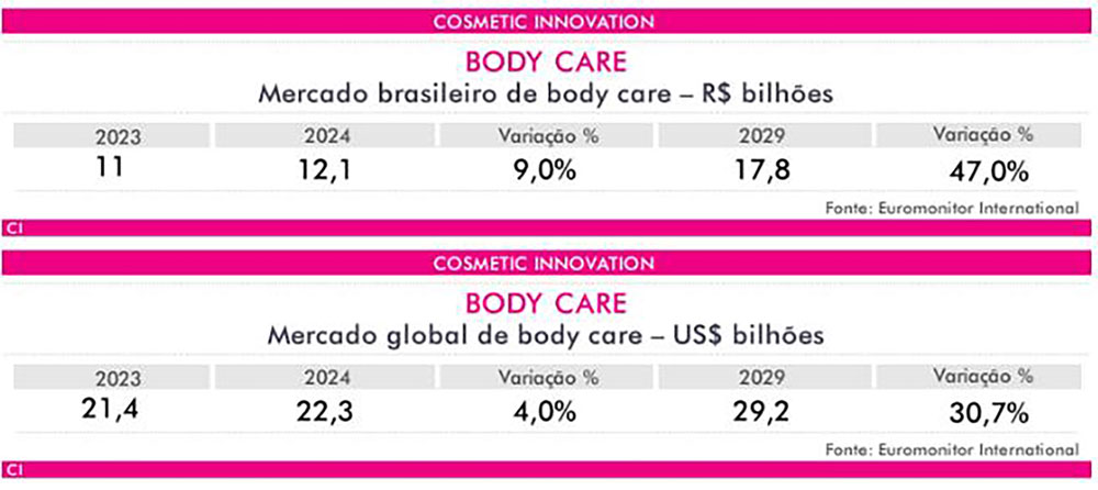Confirmando a relevância dos produtos de cuidados com o corpo para o consumidor brasileiro, a Euromonitor apurou que, enquanto o mercado total de skincare ocupa a oitava posição no ranking global, com vendas que somaram R$ 22,3 bilhões em 2024, body care respondeu por quase 50%, atingindo R$ 12,1bilhões, colocando o Brasil como o segundo maior mundial, atrás apenas dos Estados Unidos.