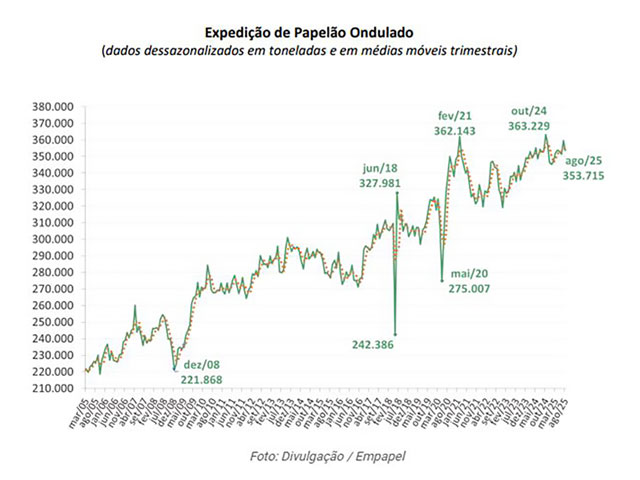 Apesar da queda no índice, volume expedido no mês foi o segundo maior da série histórica para agosto O Boletim Estatístico Mensal da Empapel mostrou que o Índice Brasileiro de Papelão Ondulado (IBPO) registrou queda de 1,8% em agosto de 2025 na comparação com o mesmo mês do ano anterior, alcançando 165,3 pontos (base 2005 […] Continuar lendo