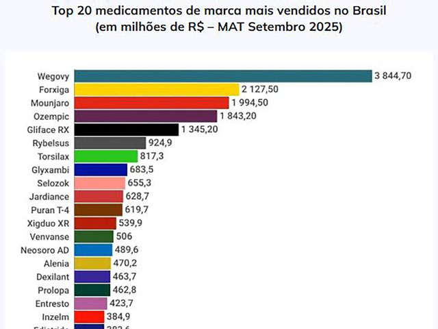 Ranking aponta que categoria movimenta R$ 19 bilhões nas farmácias, impulsionada especialmente por diabetes e obesidade Levantamento da IQVIA apresentou os medicamentos de marca mais vendidos nas farmácias brasileiras nos últimos 12 meses até setembro de 2025. Essa categoria gerou R$ 19,6 bilhões de receita no período, impulsionada principalmente pelos tratamentos para diabetes e obesidade. […] Continuar lendo