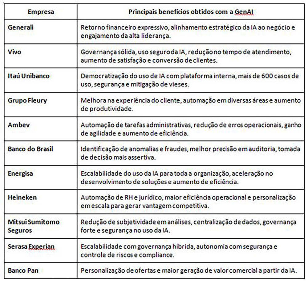 O levantamento mapeou as práticas adotadas por grandes empresas no Brasil, como Ambev, Vivo e Itaú Unibanco, e identificou cinco pilares que diferenciam as organizações mais maduras em GenAI: alinhamento da IA à estratégia de negócio; integração ampla e automação corporativa; democratização de dados; criação de plataformas internas com governança estruturada; e foco em eficiência operacional e personalização.